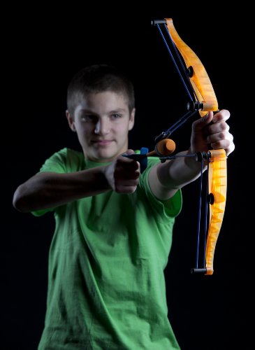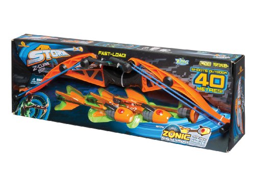 Unleash your inner warrior with the Air Storm Z-Curve Bow! Hook one of the three arrows in place, pull back and let it fly up to 40 metres. Two arrows are special screaming arrows that whistle as they fly. The other has a special suction tip that can stick to surfaces. Great for archers aged eight and up. The Z-Curve bow uses human power so no batteries are needed!