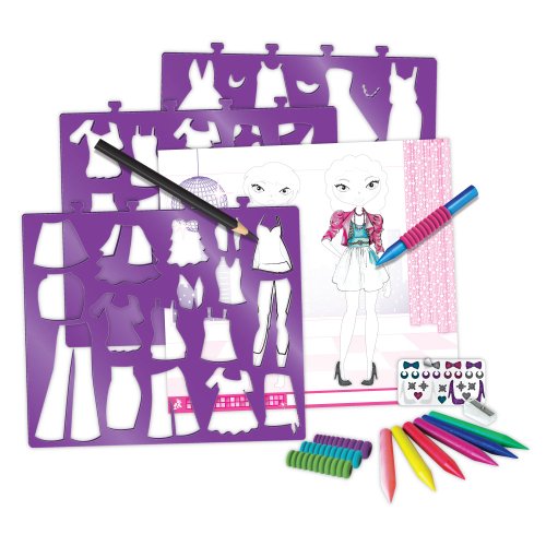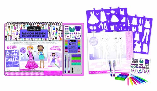 Fashion designers of all ages will love creating stunning fashions with the Fashion Angels Fashion Design Sketch Portfolio Artist Set! This portfolio features 40 drawing pages and 6 removable stencils that will help young fashionistas draw a dream clothing collection. Simply use the stencils to trace the clothing and accessories on the preformatted model sketch pages. Then shade and add details to your drawings with the Tree-Free colored pencils and glitter pens. Finish your glitz and glam designs with the glitter stickers. The set includes the spiral bound Fashion Design Sketch Portfolio with 40 sketch sheets, 6 removable plastic stencil sheets, 7 Tree-Free colored pencils, 4 pencil grips, 1 pencil sharpener, 2 glitter pens, 1 sheet of glitter stickers, plus instructions and inspiration for the ultimate in designing fun.