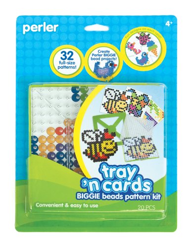 PERLER-Tray 'N Cards Biggie Beads Activity Kit. This fun set is convenient to use and will provide hours of entertainment for kids! It includes a pattern cards to make thirty-two projects using Biggie beads. The handy tray makes keeping the pattern in place a breeze. Simply place the pattern card onto the tray; snap the clear pegboard on top; and follow the design to complete the project. Each package contains one clear pegboard; one tray; sixteen double-sided pattern cards; ironing paper; and instructions. Beads not included. Recommended for ages 4 and up. Imported.