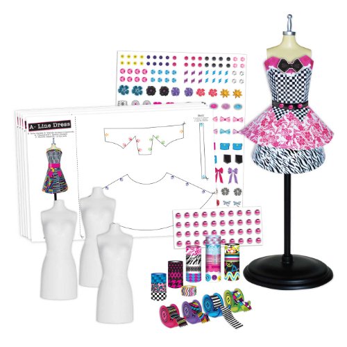 Create a clothing collection of runway-worthy pieces with the Project Runway Tapeffiti Fashion Design Challenge. It has never been easier to create clothing. Choose your favorite dress, top or bottoms pattern and cut it out. Then pick from 24 rolls of trendy Tapeffiti decorative tapes and cover the patterns any way you like. The instructions provide inspiration and tips on how to complete your looks with details like belts, collars, pockets, and more. Fit the finished pieces around the mannequin and secure, and you can store them on the display forms. These pieces will fit around any 12″ fashion doll, so you can get your models ready for your runway show. This kit includes a dress form, 3 display forms, 24 rolls of Tapeffiti and 5 dispensers, 15 clothing pattern sheets to make 15+ outfits, clear tape, stickers, and instructions.