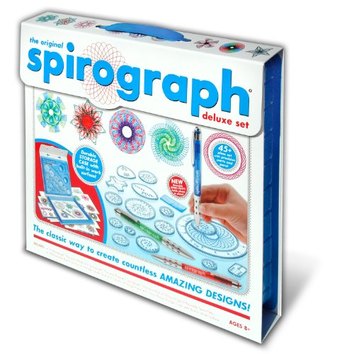 Spirograph is back, and it's better than ever. Your whole family can have hours of creative fun with the amazing Spirograph Deluxe Set. Since it was first introduced in 1965, Spirograph has made it possible for aspiring artists of all ages to create beautifully intricate designs. Originally developed by mechanical engineer Denys Fisher for use as a drafting tool, the Spirograph's distinctive wheels and rings cleverly combine the principles of art and mathematics in a way that has inspired and delighted generations. Now you can create your own cool designs and awesome pictures with this fun Spirograph Deluxe Set, winner of the ASTRA 2013 Best Toys Award. This set features all the iconic wheels and rings of the original, re-engineered and updated for today. Simply choose from the gears and wheels, put your paper in place, and create whirling, spiraling, mix and match patterns for a totally awesome image. Use the design guide to try out tried and true designs, or get creative and create cool and colorful graphics of your own. The 45-piece Deluxe Set includes 19 Spirograph Precision Wheels, 2 Spirograph Precision Rings, 1 Spirograph Precision Rack, 0.21 ounces of Reusable Spiro-putty, 3 Retractable Ballpoint Pens, 14-page Guide Book and 20 sheets of design paper. It all comes in a carry-along storage case with a built-in work surface. For age 8 and up. Brought to you by Kahootz Toys, where we use our skills and passions to bring great kids' products into the world.