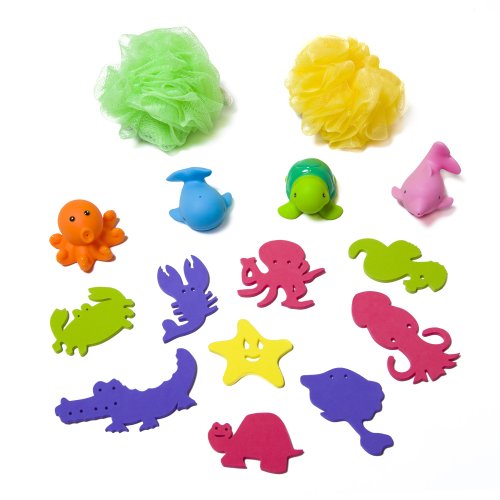 • 15 piece set includes 4 squirtees, 2 scrubbies and 9 foam floating stickers