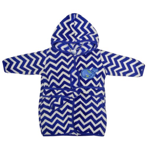 This cozy fleece bath robe will keep baby nice and warm after bath time this adorable blue and white chevron print robe has a large whale applique with solid blue bias coral fleece.