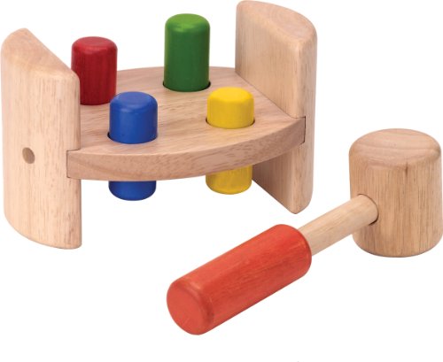 The four colorful wooden pegs can be pounded until they drop down. Then turn the unit over and start again! A classic toy that helps to develop eye-hand coordination.