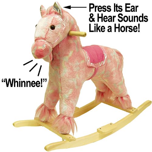 This pretty pony is sure to be your little cowgirl's favorite. It is brightly and delightfully colored, and is soft and plush to the touch. It is hand crafted with a hard wood core, and stands on sturdy wood rockers. The horse features a matching bridal and saddle, along with lifelike neighing sounds. This beautiful piece will surely be a focal point in any little girl's room. Plush Pink Pony Rocking Animal:Dimensions: L 28.75″ x W 14.5″ x H 25″Recommended Weight Limit: 80lbsSeat Ht. 18″Ages: 2 yrs.& up(2) AA batteries required for sound – included