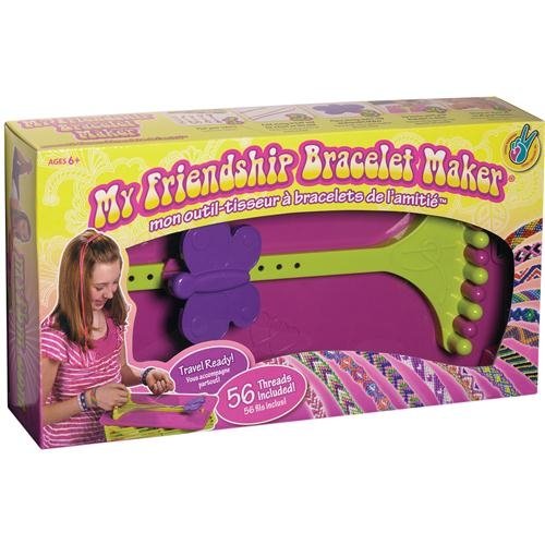 My Friendship Bracelet Maker. It's easy to make and share unique friendship bracelets with this handy tool. It features an adjustable Butterfly clip for knotting and securing your string, a String Holder for keeping up to 10 strings organized and firmly in place while you weave your design, plus it's travel-ready with a pull-out tray for storing all your threads. This package contains 1 friendship Bracelet Maker (7-1/2″ x 13″ x 3/4″), (56) 60″ threads (4 each of 14 colors), and easy-to-follow instructions. Conforms to ASTM F963. Recommended for ages 6 and up. WARNING: CHOKING HAZARD – small parts. Not for children under 3 years.
