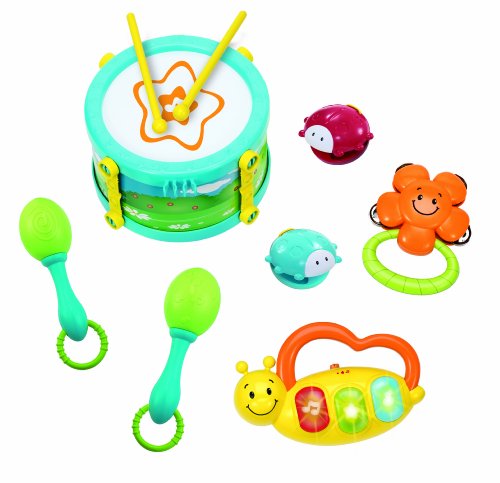 2006-NL Features: -My first band kit.-Drum with drumsticks.-Maracas, tambourine and castanets.-Bee keyboard for sound effects and melodies.-Baby will love this fun first band set.-Besides the exciting drum there are castanets, a tambourine with handle and two maracas.-Plus the bee keyboard with handle, lights and sounds.-For ages three months and up. Includes: -Two AAA batteries included.