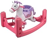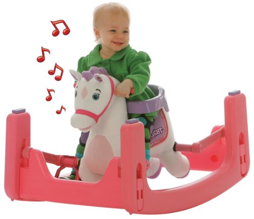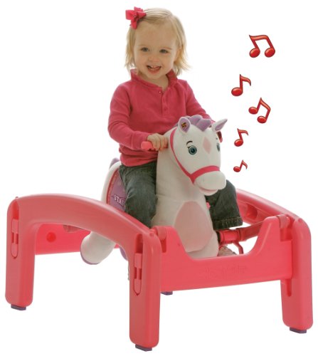 The Tek Nek Toys Rockin Rider Starlight Grow-with-Me Pony is a must-have accessory for your baby girl's room. This toy grows and changes right along with her! No tools are necessary to convert this pony from one style to the other: simply pull off the base, flip it over, and you're done. It converts from a Bouncer, to Rocker, to Spring Horse, easy as 1-2-3!The Rockin Rider Starlight Pony has a soft, huggable plush body and its mouth actually moves and is synchronized to sing, I’m a Little Pony and say six phrases to keep her entertained for hours. The second she starts to bounce, a motion-activated galloping sound begins, making her giggle with delight. This convertible pony features a sturdy plastic frame and safety spring covers so her little fingers won’t get pinched. It also comes with two-position stirrups that will grow with your child, parent volume control for you, and a fun detailed saddle. About Tek Nek Toys Tek Nek Toys believes in the power of playtime! From their home in Southlake, Texas, they've been developing unique, multifunctional toys designed to stimulate creativity and encourage interaction since 1997. Tek Nek Toys arms parents with products that provide learning and growth opportunities in order to maximize their children's playtime. They understand that toys should not only be fun, but also a way for children to expand their imaginations, coordination and social skills. Tek Nek Toys is best known for developing innovative toys that are built to last – even in the playroom. Converts from bouncer to rocker to horse. Removable safety seat and no-pinch spring covers. Huggable plush material, durable plastic frame. Patented moving mouth synchronized to sing and talk. I'm a Little Pony song, 6 talking phrases, motion-activated galloping sound. Parent volume control, detailed saddle, 2-position stirrups.