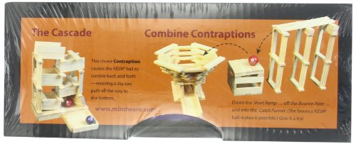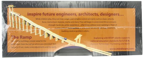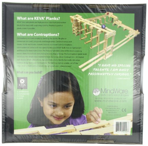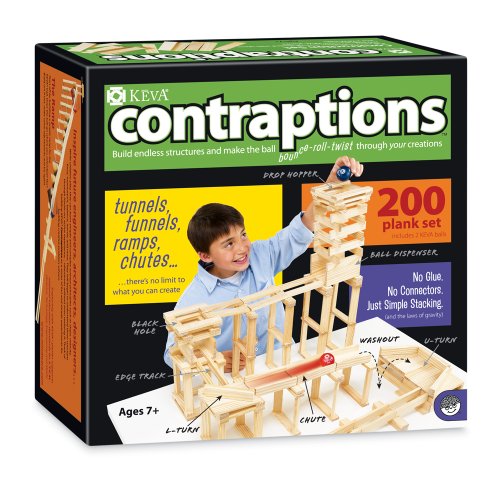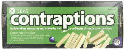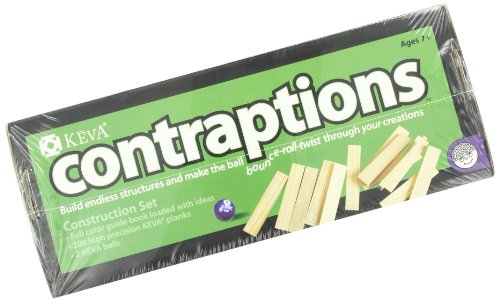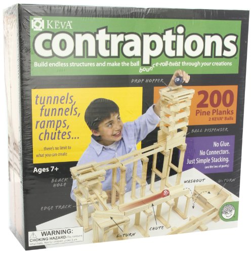 Young thinkers can build unbelievable ball track structures with this simple stacking plank system. Create ramps, funnels, chutes and crazy contraptions like the “Black Hole” and “Bounce Plate.” Then find out if the ball rolls as expected. Fostering unlimited creativity and experimentation, KEVA planks build an early understanding of proportion and balance, while teaching basic principles of physics and engineering. No glue, no connectors-just loads of constructive fun! Includes 200 identical wooden planks, 2 specially designed lightweight balls for maximum action and an 18-page idea book with project photos and quick-start instructions. KEVA Contraptions planks are made from pine.