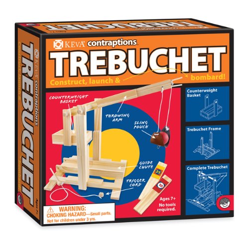 With an authentic trebuchet. Kids can build their own medieval siege engine with re-drilled planks, a little glue and the help of easy, step-by-step “blueprint” instructions. Then let the fun and experimentation begin! What travels farther, a marshmallow or a piece of macaroni? The Contraptions Trebuchet can vary its hurl by altering the counterweight; experiment to knock down a field of target planks using the two included balls.