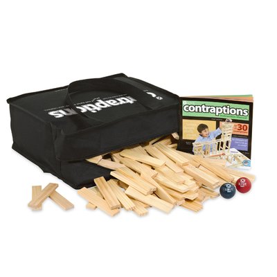 Young thinkers can build unbelievable ball track structures with this simple stacking plank system. Create ramps, funnels, chutes and crazy contraptions like the “Black Hole” and “Bounce Plate.” Then find out if the ball rolls as expected. Fostering unlimited creativity and experimentation, KEVA planks build an early understanding of proportion and balance, while teaching basic principles of physics and engineering. No glue, no connectors-just loads of constructive fun! Includes 400 identical wooden planks, 2 specially designed lightweight balls for maximum action and an 18-page idea book with project photos and quick-start instructions. Contraptions planks are made from pine.