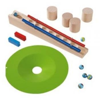 First comes the ball jingling down the ringing track, then they speed along the meadow funnel … but only if the two magnetic blocks are positioned at the right spot will they not zip over the edge but disappear, spiraling down through the hole in the center. Set includes 1 meadow funnel, 1 ringing track, 4 round columns, 2 magnetic blocks and 6 marbles. Made in Germany