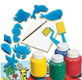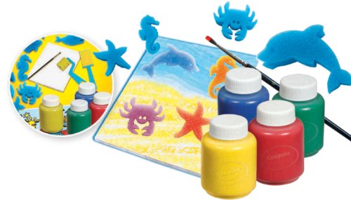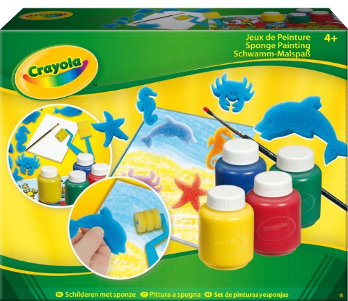 Kit Jeu de peinture Crayola Associe la peinture, les éponges, le rouleau et la spatule pour réaliser de superbes effets. Pour les finitions, utilise le pinceau. Contient : – 8 éponges vie sous-marine – 4 bouteilles de peintures de 60 ml – 1 rouleau à motif – 1 spatule de peinture – 1 pinceau – 1 bloc de papier – 1 set de table Pour un enfant de plus de 4 ans. Conforme aux normes CE.