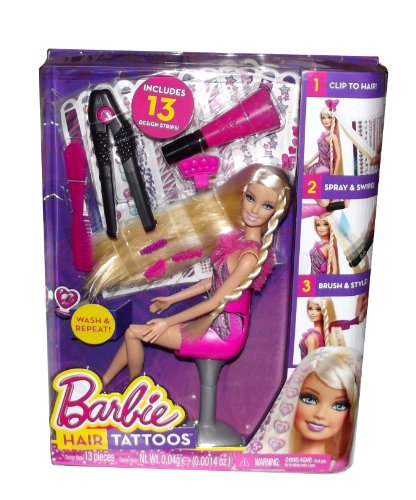 Barbie Printastic Hair Doll: Barbie doll gets a totally awesome decorated 'do with a series of totally cute hair tattoos girls can apply to her already fabulous long blonde locks. Seat her in the salon chair, and decide which of the many design options makes the perfect statement. The set comes with 13 design strips! Then simply clip a strip to Barbie doll's hair, wet the hair with the included spray bottle and use the realistic (no heat!) flat-iron tool to swipe and transfer the decals to Barbie doll's hair. The swiping iron tool makes it easy. Then style the decorated locks to create even more fabulous looks. Add stars, hearts, flowers or graphics. The hair tattoos stay in place, even with brushing! Accessories like a comb, barrettes and a clip let girls twist, braid and hold to create a nearly endless variety of glamorous hairstyles. When complete, Barbie doll can admire her new look with the tiny heart-shaped hand mirror. Too much? Too little? Wash it out, and start all over! Includes Barbie doll dressed for a day at the salon, colorful decals, special spray, comb, clip barrettes, heart-shaped mirror, flat iron and stylist's chair. Doll cannot stand alone. Ages 5 and older.
