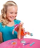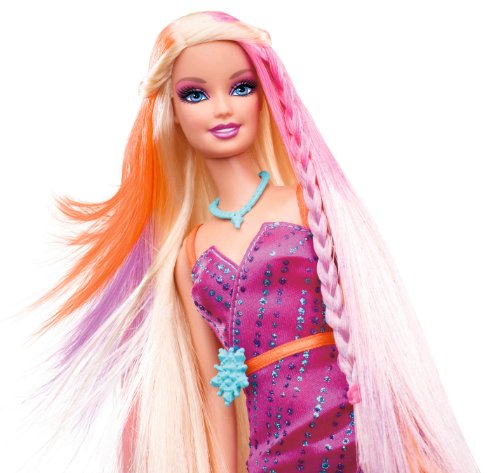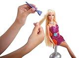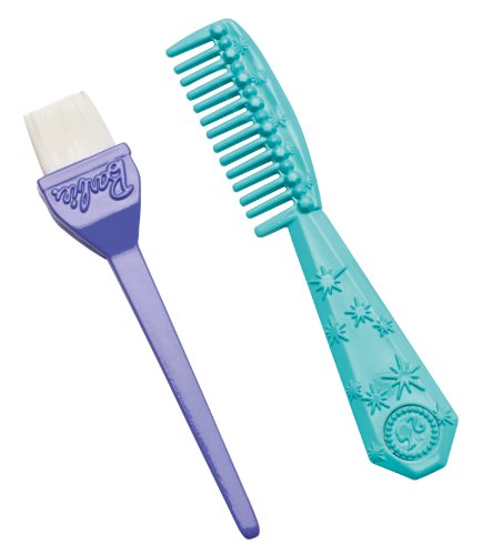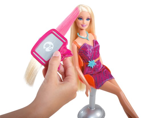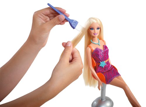 Barbie, assise sur sa chaise, est prete pour refaire sa couleur de cheveux Un peu d'eau et des papiers transferts de couleur permettent de realiser de jolis degrades multicolores dans ses tres longs cheveux blonds.