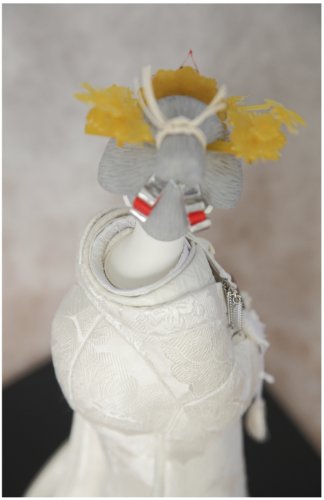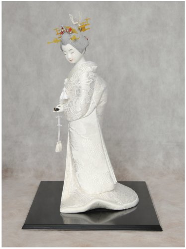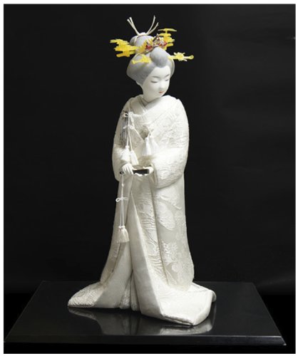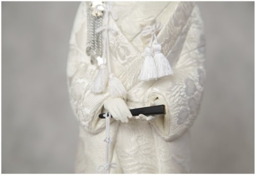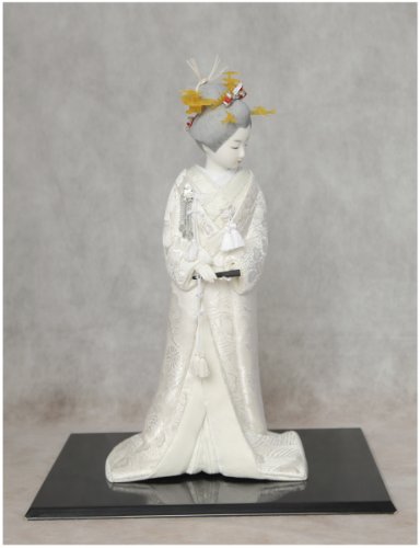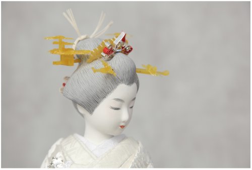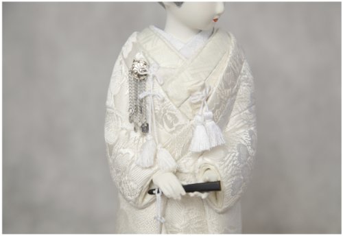 Ayako Niikura who works as a creative doll artist and lecturer spared no pains over the work to create this product. The expression of the dolls face is remarkable. The sensitivity is full of gentleness. The story behind this doll “Finally the rain that scattered the cherry blossoms has stopped. The white color of the Shiromuku (white kimono) is a pure sacred color, which represents the decision of the bride to become part of the family of the man she will marry. This has been the most formal bridal dress from the Edo era to the modern times. This work of art has a magical warm feeling, by modestly expressing the pleasure and happiness of the bride wearing the dress she has always wanted to wear since her childhood. Creative wood carving/Kimekomi finished