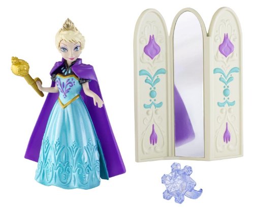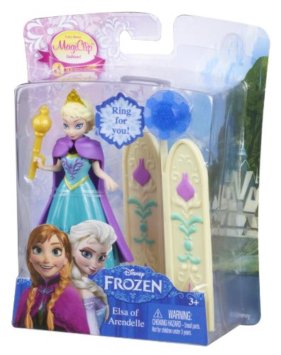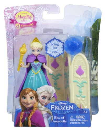 Disney Frozen Magiclip Small Doll Elsa Giftset: This charming collection features adorable Anna and Elsa small dolls from the upcoming Disney feature Frozen. Anna and Elsa are sisters living in the enchanted Kingdom of Arendelle, each with her own unique personality and style! These sets allow girls to reenact unforgettable moments from the film. Both dolls are dressed in fashions fans will recognize from the movie and come with accessories for the dolls and a ring for girls! Anna's set features a vanity (with a working drawer!) and a snow globe as well as a charming pink ring for the girl. Elsa comes with a dressing screen (whose middle panel is a mirror) and a scepter; her girl-sized ring is designed with a snowflake. The small doll fashions are in MagiClip form that is gentle on small fingers and so easy to dress. Each also wears a majestic cape and tiara to complete her iconic look. Girls will love imagining new adventures for these two charming characters! Each sold separately. Dolls cannot stand alone. Ages 3 and older