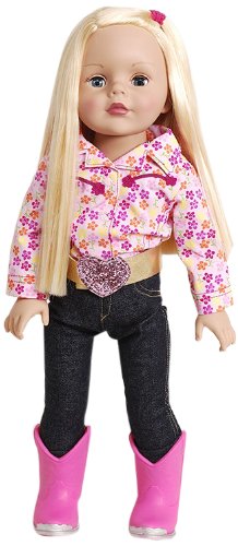 18 inch Cowgirl Cool Favorite Friends doll has blue eyes and long blonde hair. She's wearing a country star outfit, with a pink floral western shirt, blue jeans and pink cowboy boots. Add a gold belt with a sequin heart buckle and she's ready for the stage.