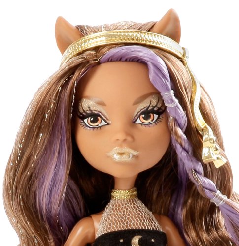 Clawdeen Wolf doll’s black mini-dress is accented with a gold print, while her long open skirt features layers of sheer black and purple, decorated with sparkles and moon designs. What could be more fierce? She accessorizes this ultra-glam outfit with strappy heels, winding bangles, a golden belt, and a sleek matching headband. To top off her killer ensemble, creepy-chic Clawdeen Wolf wears spooktacular makeup, including shimmery eye shadow and lipstick. Plus, her long, flowing hair is styled with gore-geous gold detailing and signature purple streaks to match her freaky-fab fashions and lantern. This to-die-for look is a scream come true. Girls can play out spine-tingling scenes from the movie Monster High 13 Wishes and invent their own adventures with this Clawdeen Wolf doll. To expand the fashionable fun, collect all the dolls in the assortment, including Frankie Stein and Draculaura (each sold separately). Your ghoul will shriek with delight.