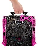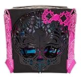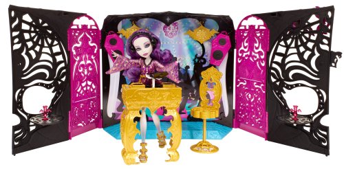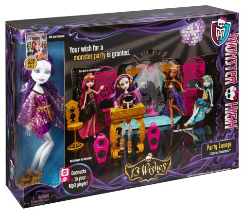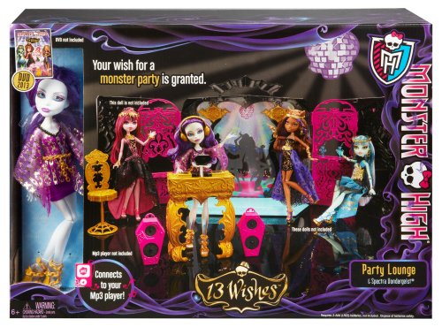 Monster High 13 Wishes Room Party & Doll: Your wish for a monster-size party has been granted! The 13 Wishes party lounge is a great place for the Monster High ghouls to all fang out. When you open the case, it’s time to monster mash! Girls can plug in their mp3 player and play their tunes right through the party room. The club setting has chic pink and black walls with web series-inspired elements, elaborate cuts-outs and a dance floor background. Small counters fold down to hold monsterific drinks. There’s a golden DJ table, doll headphones and high-backed chair for ghouls to make their rockin’ selections. The event space is one of Spectra Vondergeist doll’s favorite places to haunt and hear ghostly gossip, and she looks absolutely boo-tiful doing it! Her party dress features genie-inspired rich colors, swooping sleeves, golden details, short chic skirt, belt and phantasmic ankle boots. When the party is ready to wrap or move location, just fold everything up for easy storage and quick portability! The 13 Wishes party lounge guarantees a spooktacularly good time. Includes Spectra Vondergeist doll, an mp3 plug-in and a themed piece-count.