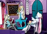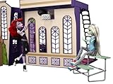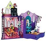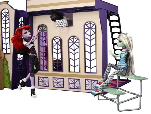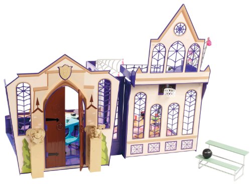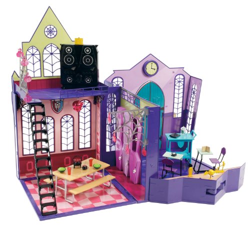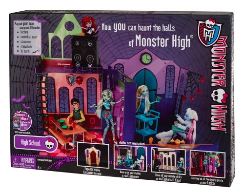 Your Monster High dolls will haunt the halls of Monster High School with this fold out play set. The Mattel Monster High High School includes lockable lockers with skull locks, a mad science classroom, casketball court, and Creepateria with a DJ booth. Included accessories include wacky creepateria food, trophies, and school supplies for your monsters. It expands to play and collapses to store. Take it anywhere with the carry handle.