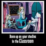 In the Mattel Monster High School play set, the classroom has two desks for your Monster dolls to sit in while in class. There's a science cart with wheels and a three eyed frog in a jar, along with a blackboard and a spooky spider web clock on the wall.