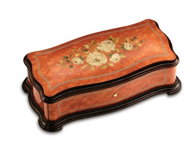 This box is made with burr madrona and has a beautiful inlay of roses in dyed maple. Comes with a traditional 3.144 movement. This is one of the most prestige music boxes produced in the world today. You can put your tune selections in the comments field when you are checking out through the shopping cart, and of course you can call us or email us with your tunes and/or questions after your order. It's features are: 3 tunes. 144 notes Dimensions: 400 x 210 x 130 mm To view different tunes you can get with this item please visit the Reuge Web site here :Reuge Music Tune List Please call or email us with further questions on this remarkable and definitely one of kind item.