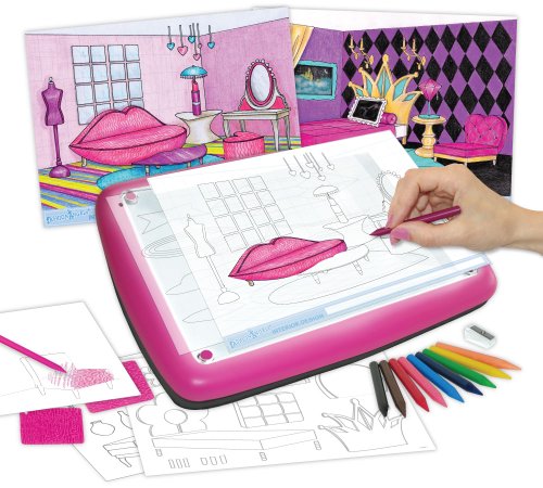 Design dream rooms with this interior design light-box studio set. This set includes light-box, colored pencils, 10 films (100+ furniture and décor designs), 50 interior design sketch sheets, texture rubbing plates an design guide.