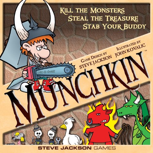 168 cards, 6 pawns, 6 player cards, gameboard, rules, and die. Suggested Retail Price $29.99 Stock #1483 UPC 837654320976 In ProductionWhat makes this edition “deluxe”? It's got a big gameboard to keep your cards in place, and six colored pawns that you move on the gameboard as you level up! Plus a card to go with each pawn, to make it easy to remember who is what color and whose sex has changed!Go down in the dungeon. Kill everything you meet. Backstab your friends and steal their stuff. Grab the treasure and run.Admit it. You love it.Munchkin is the mega-hit card game about dungeon adventure . . . with none of that stupid roleplaying stuff. You and your friends compete to kill monsters and grab magic items. And what magic items! Don the Horny Helmet and the Boots of Butt-Kicking. Wield the Staff of Napalm . . . or maybe the Chainsaw of Bloody Dismemberment. Start by slaughtering the Potted Plant and the Drooling Slime, and work your way up to the Plutonium Dragon . . .And it's illustrated (in full color!) by John Kovalic!Fast-playing and silly, Munchkin can reduce any roleplaying group to hysteria. And, while they're laughing, you can steal their stuff.