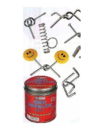 A set of five high quality puzzlers packaged in a reusable gift tin. Metal puzzles are approximately 2 1/2″. Styles may vary.