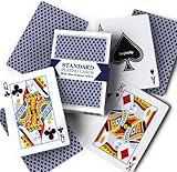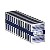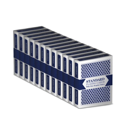 This set contains 12 decks of blue playing cards. Each deck is wide (poker) size with a standard index. The cards measure 3.5″ x 2.5″. The cards are made from plastic-coated paper, which makes them durable and easy to clean. These cards are perfect for use in at-home games, poker tournaments, goody bags, stocking stuffers and more. Each deck contains 52 cards and two jokers.