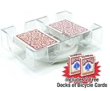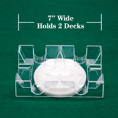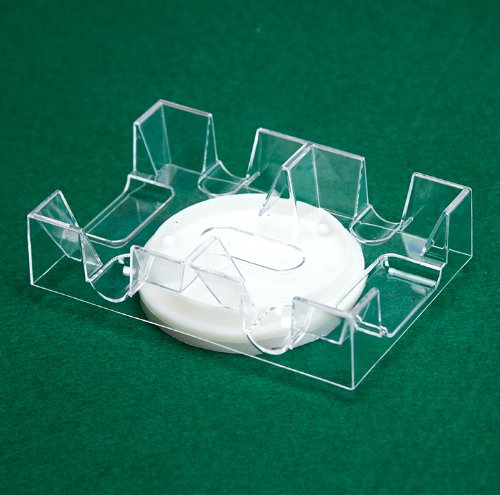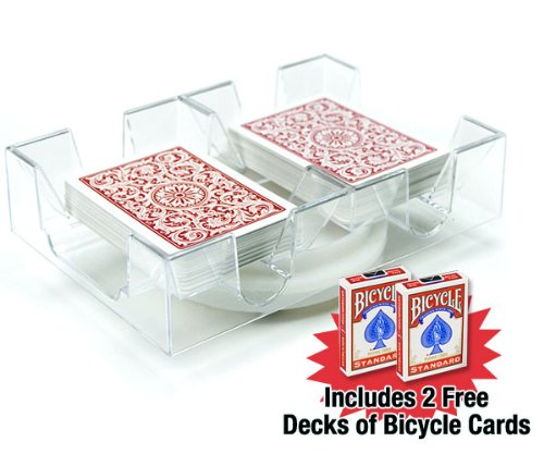 DescriptionMake your next card game easier with this two-deck, rotating/revolving card tray. This revolving card holder is perfect for any card game with give and take hands. Made of sturdy plastic, the clear holder swivels on a turn table base to make drawing cards easier. Each tray can hold up to two decks of standard playing cards, including Kem or Copag. Two free decks of Bicycle playing cards are included. Styles and colors may vary.