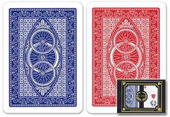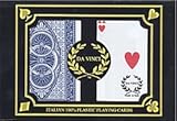 DescriptionDa Vinci 100% Plastic playing cards are the world's finest playing cards. Da Vinci cards are designed and manufactured in Italy by Modiano. Since 1868, the Modiano brand has been synonymous with quality playing cards. Da Vinci plastic playing cards are manufactured using the finest plastic and are comparable or better than both KEM or Copag cards and at less than half the price of Kem cards. Da Vinci playing cards will not scratch, tear, or crease under normal playing conditions. Durable and washable, a properly cared for deck will last for years and years! Da Vinci cards come with a life-time replacement warranty for defects or damaged/missing cards. Please see the warranty card inside each deck for details. The set includes 2 decks of poker size (2 1/2 x 3 1/2) regular index cards with 2 cut cards in a hard shell case.