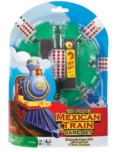DescriptionThe POOF-Slinky 0X5478 Ideal Mexican Train Game Set is the perfect accessory for hours of train building fun with electronic whistle sound effects. This set includes everything you need to transform any set of double twelve dominoes into the popular Mexican Train Game. Mexican Train is played with double twelve dominoes (not included) that run from double blank to double twelve. Each player picks a certain amount of dominoes to start the game. The object is to form a path called a “train” that starts from the game's electronic center “hub”. The game starts with the double twelve domino and the player who plays the center domino, plays off the twelve domino to start their train. If they don’t have a move, they take a domino from the leftovers pile. If the new domino doesn’t have a play, that player marks their train open with “train marker”. Once each player has started their train, they can either A) play on their own train, B) start the “Mexican” train in one of the empty slots by playing off the center domino or C) play on another player's train if it has a “train marker”. Each round lasts until a player has played all their dominoes and receives a score of (0) for that round. The other players count their remaining domino values for their round score. Points from all (13) rounds are tallied at the end and the lowest score wins! The winner of the game then gets the honor of pressing the center domino to hear the “Toot Toot” from the electronic game hub. Ideal’s Mexican Train Game Set is designed for 2-8-players and includes a patented 3D electronic game, batteries, (9) train game pieces and Mexican Train Game instructions. The Ideal brand provides a wide variety of games, activity kits, magic sets and classic toys that parents remember from their own childhood years. The POOF-Slinky 0X5478 Ideal Mexican Train Game Set is recommended for children 8-years of age and older. POOF-Slinky, Inc. is the maker of POOF, Slinky, Ideal and Scientific Explorer Brands.