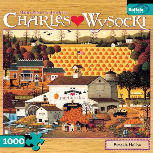1000-Piece Charles Wysocki Jigsaw Puzzle: Pumpkin Hollow by Buffalo Games takes you back to the nostalgia of the old pumpkin patch. Charles Wysocki is a master painter of Americana. Includes imaginative and colorful artwork.