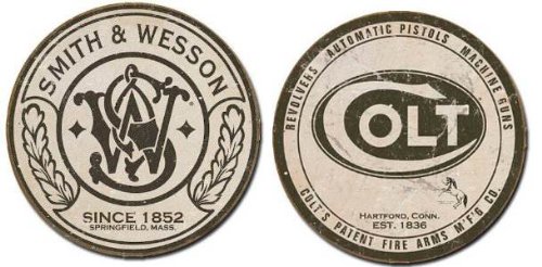 Set of Two Signs: Smith & Wesson and Colt 11 x 11 Round Tin Signs