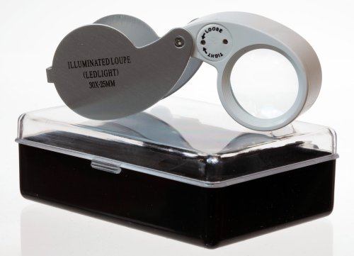 Mighty Bright Loupe This 8X folding loupe in white plastic and aluminum has a pair of very bright white LEDs next to the lens. Runs on (3) button-cell batteries, included, and has a tiny wrench to help you replace them. When folded, it looks like a standard coach's whistle, or a really big apostrophe. Forgive the package for saying 30X – if it didn't say it, we wouldn't have it!