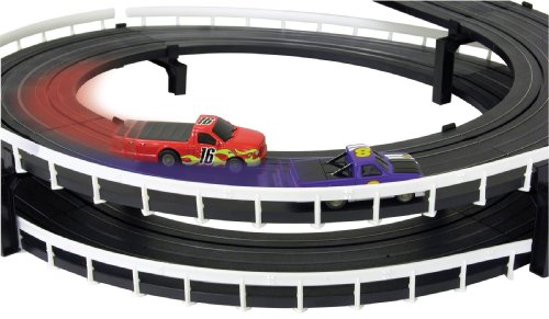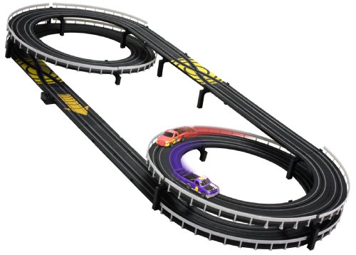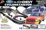 433-9140 Features: -Ford vs. chevy cyclone canyon.-Ford F-350 Truck competes head-to-head against the Chevy Silverado on this 17.5 foot track.-Whirl through two challenging cyclone curves.-Cut off your opponent in the lane changing cross-over tracks but beware of a wreck.-Set up Size: 20'' x 53''.-Not recommended for children under 8 years of age. Warranty: -1 Year manufacturer's warranty.