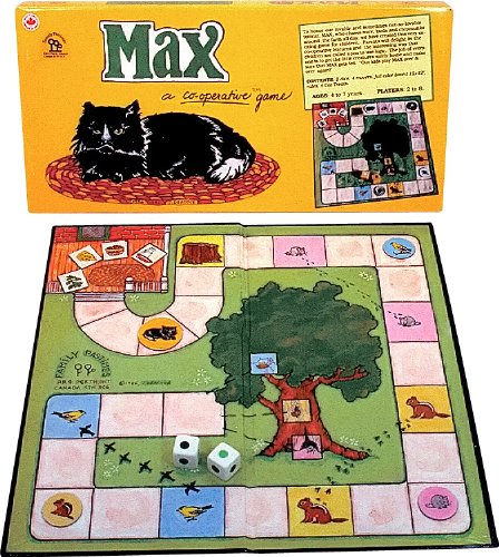 This board game doesn't pit players against each other in competition. Instead, all players work cooperatively to get a bird, a chipmunk, and a mouse (collectively known as Little Creatures) safely home before Max the Tomcat catches them and, presumably, eats them! The dice have single spots–either black or green–on each face. Black spots move Max, green spots move the Little Creatures. Players roll the dice and, in consultation with each other, decide which pieces to move in a game-long effort to foil Max. A refreshing twist on more traditional board games, this is a win/win situation for the players. They will undoubtedly always be able to save at least some of the Little Creatures from Max! Children might need help from an adult in separating the cardboard game pieces. The full-color game board is 12 inches square. –Wendy Slotboom