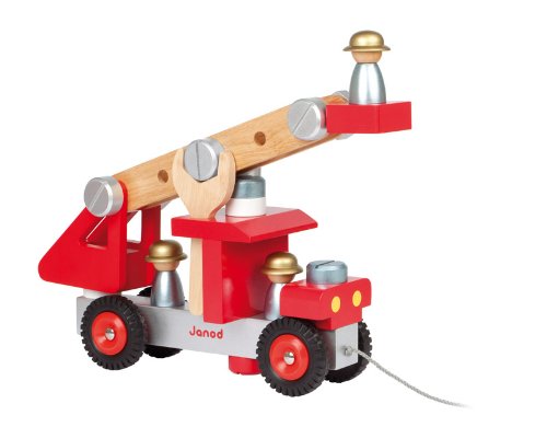 Janod DIY truck with detachable sections. Includes 27 pieces, including 2 tools and 3 fire fighters. Approximately 11.8in x 3.9in x 6.3in. Suitable for babies aged 18 months and up. Little handyman in the making will go wild for this bold Janod DIY Fire Truck with its brilliant array of tools and the screws, nuts and bolts to practice on.