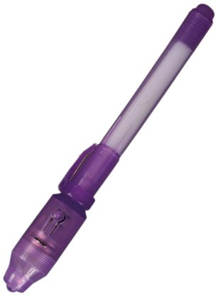Mit UV-Licht. Den muss man einfach haben. Damit kann man die geheimsten, völlig unsichtbaren Geheimbotschaften schreiben, und sie dann mit dem UV-Licht, vorne am Stift, lesen. Mit drei Batterien. farblich sortiert, keine Auswahl möglich.