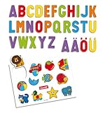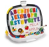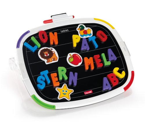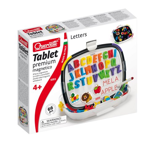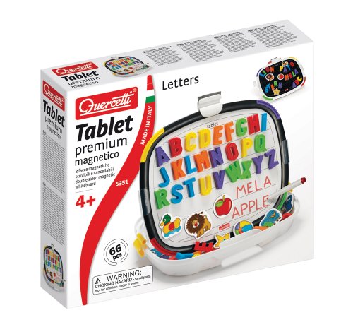 This board features 2 magnetic sides, including a dry-erase board. Set includes double-sided board with rounded edges, 48 letter magnets, 10 magnetic cards, 1 dry erase marker, 1 eraser and 2 support feet to display your work. Board measures 12 7/8″ wide and 11″ tall.