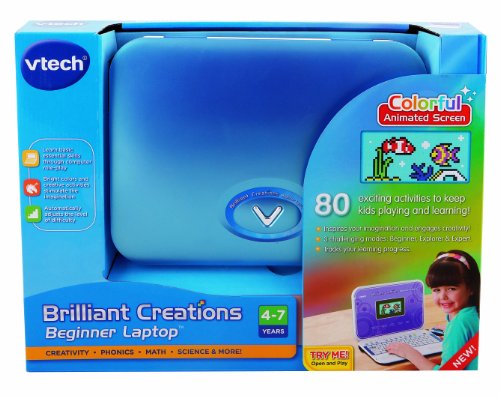 With the Brilliant Creations Beginner Laptop your child is connected to an entire world of learning. This computer features an LCD color screen and educates your child in a fun and colorful way through 80 learning activities that focus on creativity, letters, vocabulary, counting, matching and more. A real working mouse and joystick are included for added interactivity. Point and click your way to learning fun with the Brilliant Creations Beginner Laptop by VTech. This innovative role-play computer looks like the real thing and comes loaded with 80 activities featured on a brilliant color screen to educate your child in essential skills. LCD color screen. 80 Learning games. Includes working mouse and joystick.