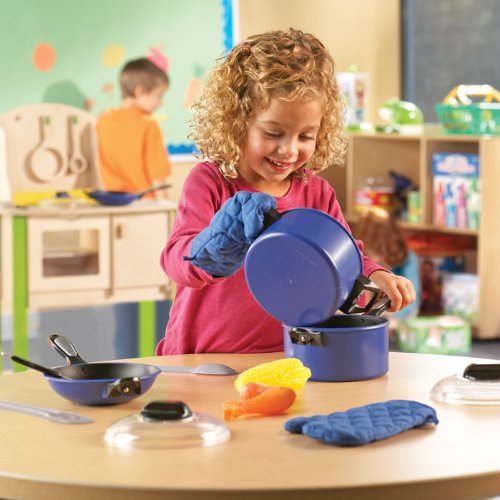 - Includes large deluxe stock pot, saucepan, 2 lids, skillet, spatula, 2 cooking spoons, oven mitt, play food and write and wipe activity guide