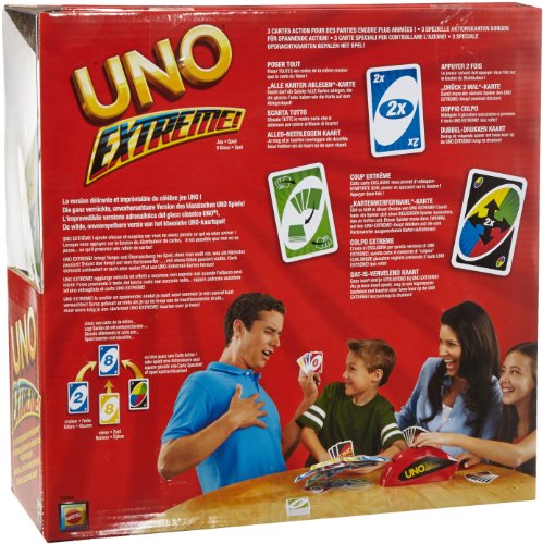 MATTEL Uno Extreme Relaunch. Noch mehr Spannung und Tempo bietet diese verrückteneue Version des bekannten und beliebten Spiels UNO Extreme! Der neu hinzugekommene elektronische Kartenwerfer und die exklusive Extreme-Karte garantieren einen unvorhersehbaren Spielverlauf. Drückt man oben auf den Kartenwerfer, passiert, wenn man Glück hat, nichts. Hat man Pech, spuckt er einewahre Flut von UNO Extreme-Karten aus. Dabei werden unterschiedliche Geräusche aktiviert, je nachdem, ob Karten ausgeworfen werden oder nicht. Praktisch zum Mitnehmen für unterwegs und zum Aufbewahren: Alle 112 Karten lassen sich direkt im enthaltenen Kartenwerfer verstauen. Für 2 bis 10 Spieler ab 7 Jahren.