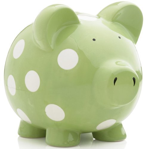 DescriptionStart off your baby's savings right with this unique piggy bank from Elegant Baby. We've taken this traditional nursery accessory and made it fashionably contemporary by making it huge! Measuring 9″x 9.75″x 11″, this stylish piggy bank is a stunning addition to any nursery with its awesome green color paired with white polka dots. Because they're hand-painted, no two Elegant Baby piggy banks are alike. It's packaged in a clear PVC Elegant Baby box, so this bank makes a perfect gift for any baby