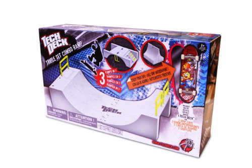 Set up a fingerboard ramp for any trick style with the Triple Set Combo Ramp. There are three ways you can set up this awesome Tech Deck ramp set: Open it up to create a half pipe. Flip it over to create a ramp and a set of stairs with a rail. Close the set to create a banked wall ride. The Triple Street Set also comes with an exclusive 96mm Tech Deck fingerboard , with standard grip tape and new Sticky Grip tape that makes it easier to pull awesome tricks.