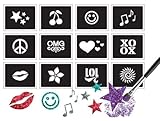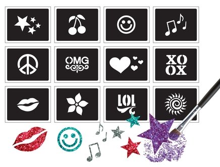 Adorn yourself with temporary glitter tattoos! Combine 4 colors of glitter to make your own unique creations. Use the stencils again and again! Each kit has 4 colors of glitter, 12 stencils, 2 brushes, tattoo glue and easy instructions.