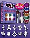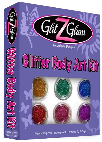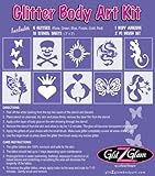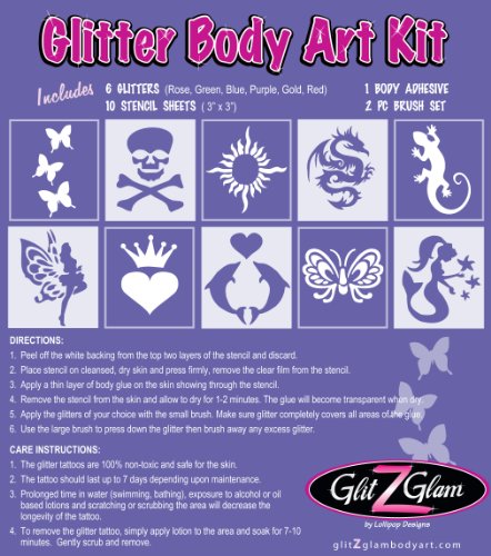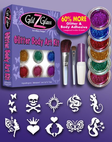 DescriptionGlitZGlam Glitter Tattoo Kit for children, teenagers and adults is a best seller with 6 large cosmetic grade glitter containers, reusable stencils (up to 3 times when used according to instructions), top quality cosmetic brushes and Hypoallergenic body adhesive! Until recently children, teenagers and adults could only get temporary tattoos and tattoos for kids at parties and special events. Not anymore! The GlitZGlam Glitter temporary tattoo kit is a “do it yourself” product that is so easy to do and no artistic skills are required. The results are simply professional-looking temporary tattoos that are waterproof (lasts up to 7 days,) safe for the skin and most importantly – glitter. GlitZGlam Glitter Tattoo Kit includes the following: Get a lot more temporary tattoos done with larger glitter, more body adhesive and more colors: Glitter size: 6 of 0.1 OZ each (compared to 4 of 0.05-0.07 OZ by other popular brands) Body Adhesive size: 7 ML (compared to 3 ML by other popular brands)
