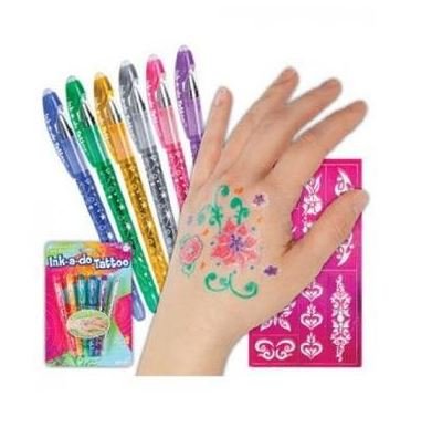 Create your own temporary tattoos with these sets of sparkly shimmering tattoo pens. Use the stencils for fun designs, or create your own. Each set includes six pens in different colors, and three sheets of stencils.